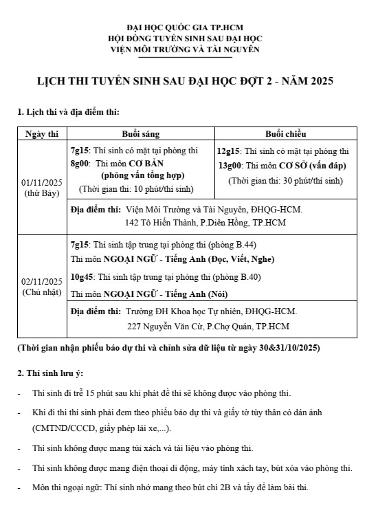 LỊCH THI TUYỂN SINH SAU ĐẠI HỌC ĐỢT 2 - NĂM 2025