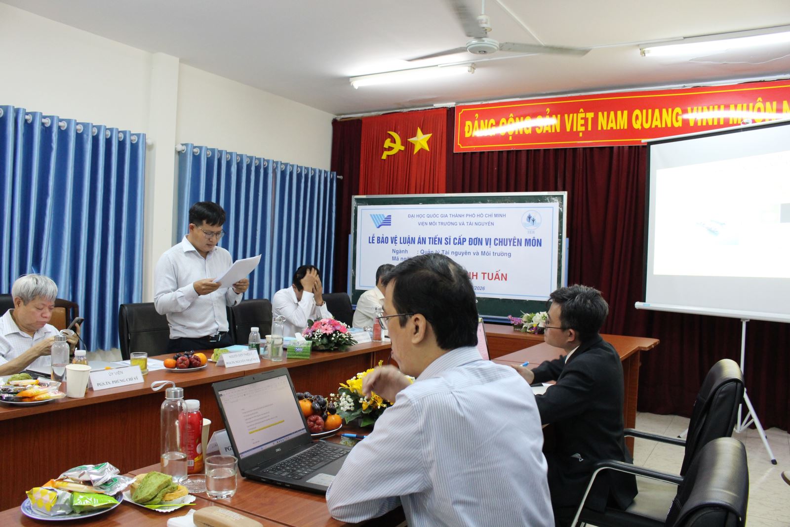 GS.TS. Lê Thanh Hải (Viện MT&TN, ĐHQG-HCM), chủ tịch Hội đồng đã điều khiển phiên họp. Hai người giới thiệu của luận án tiến sĩ là PGS.TS. Nguyễn Văn Hồng (Phân viện Khoa học KTTV & BĐKH) và PGS.TS. Nguyễn Nhật Huy (Trường ĐH Bách Khoa, ĐHQG-HCM). Hội đồng có sự tham gia của ba ủy viên là PGS.TS. Phùng Chí Sỹ (Trung tâm Công nghệ môi trường ENTEC), PGS.TS. Trương Thanh Cảnh (Trường ĐH Khoa học Tự nhiên, ĐHQG-HCM), PGS.TS. Đỗ Thị Thu Huyền (Viện MT&TN, ĐHQG-HCM) cùng thư ký hội đồng là TS. Nguyễn Thanh Hùng (Viện MT&TN, ĐHQG-HCM).