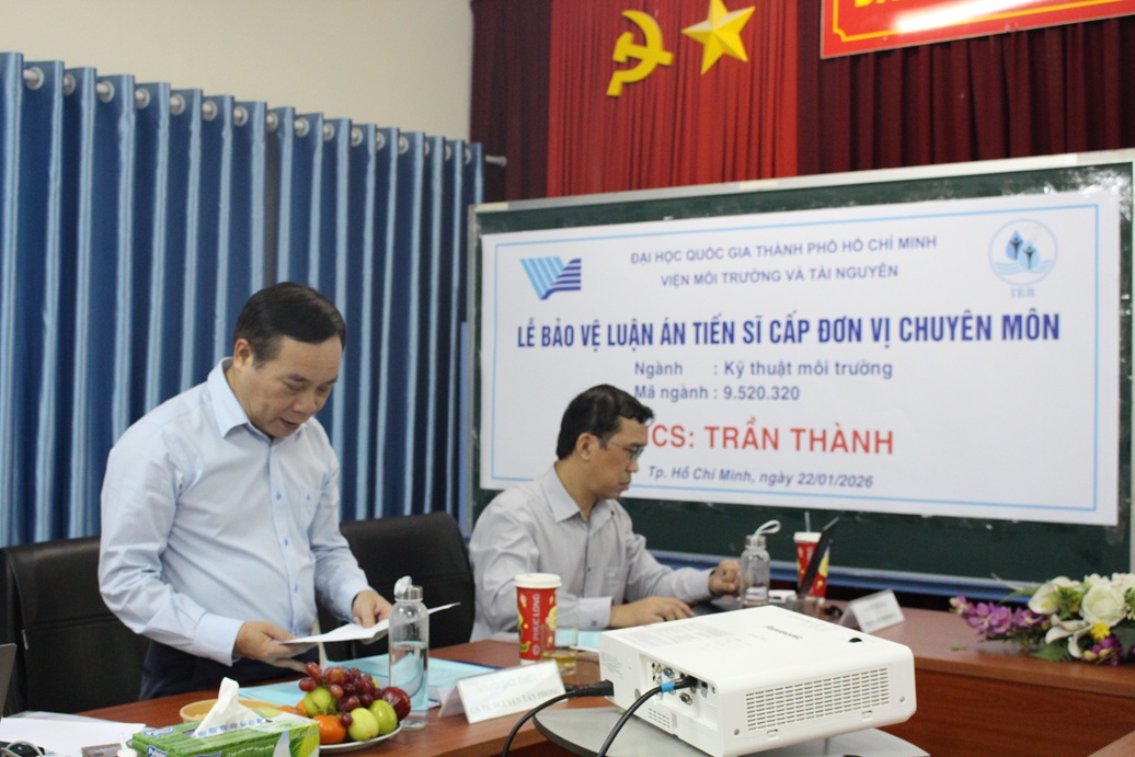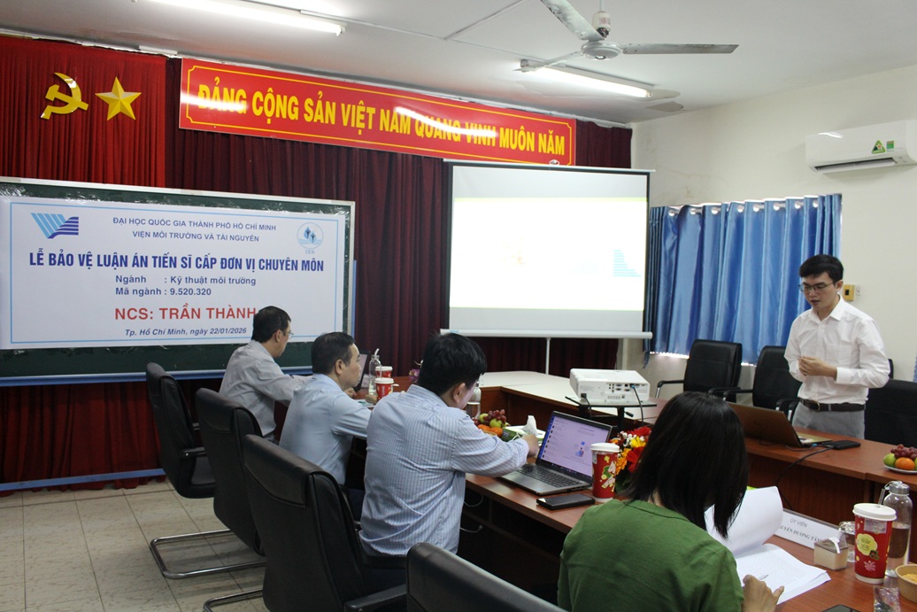 Dưới sự hướng dẫn khoa học của PGS.TS. Bùi Xuân Thành và cố PGS.TS. Lê Đức Trung, chiều thứ Năm, ngày 22/01/2026, NCS Trần Thành đã bảo vệ thành công luận án Tiến sĩ kỹ thuật cấp Đơn vị chuyên môn (ĐVCM) tại Hội đồng chấm Luận án tiến sĩ Viện Môi trường và Tài nguyên, Đại học Quốc gia TP. Hồ Chí Minh, ngành Kỹ thuật môi trường, Mã ngành: 9520320.