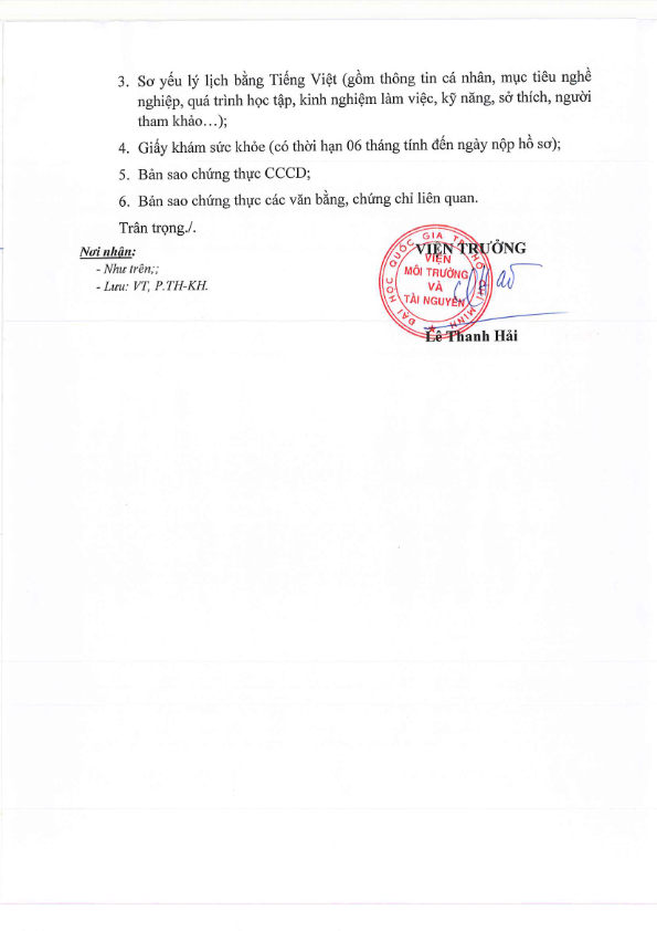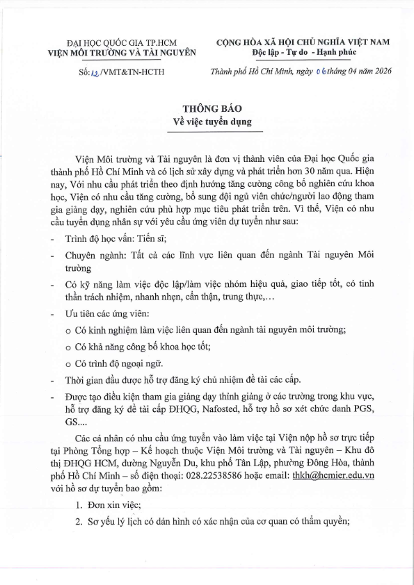 Ngày 06 tháng 04 năm 2026, Viện Môi trường và Tài nguyên ra Thông báo số 12/VMT&TN-HCTH về việc tuyển dụng