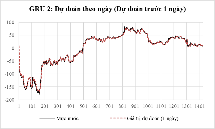 Đề tài đã sử dụng bộ dữ liệu quan trắc tự ghi mực nước dưới đất kết hợp dữ liệu mưa, triều trong giai đoạn 2020–2024 để huấn luyện và kiểm định mô hình. Bốn mô hình con cho mỗi loại (LSTM, GRU) được xây dựng tương ứng với các thang thời gian: theo giờ, theo ngày, theo chu kỳ 10 ngày và theo tháng. Kết quả cho thấy các mô hình đều đạt hiệu suất dự báo tốt, trong đó mô hình theo ngày có hệ số R² lần lượt 69,87% (LSTM) và 71,34% (GRU).
