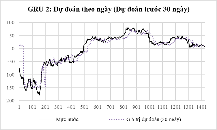 Hình 3. Hiệu suất của mô hình LSTM 4 và GRU 4 trong việc dự đoán mực nước dưới đất tại khoảng thời gian 30 ngày